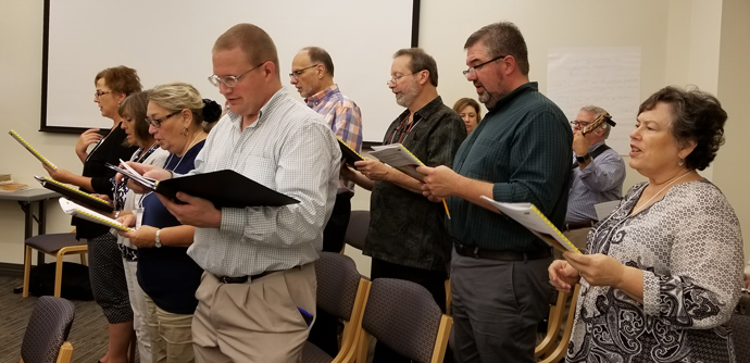 On the last day of the Archdiocese of Louisville Lay Ecclesial Assembly, music ministers from around the archdiocese led music for morning prayer. They provided music for services each day of the Aug. 6 to 9 gathering at St. Meinrad Archabbey. The assembly drew a wide variety of professional lay ministers. (Record Photo by Marnie McAllister)