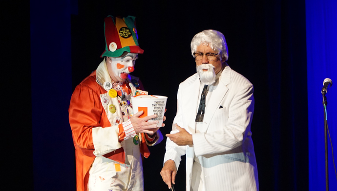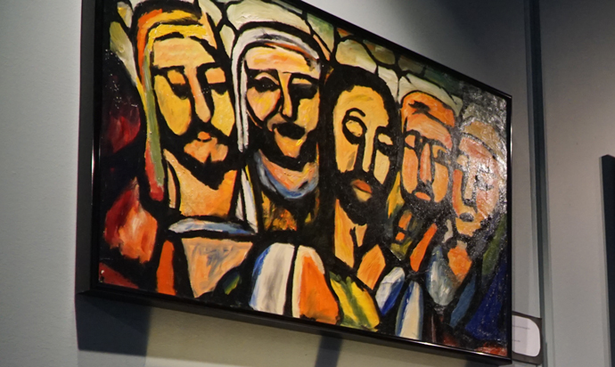 The Louisville Chapter of the National Association of Pastoral Musicians hosted a Priest Variety Show Aug. 24 at Assumption High School. Father William Hammer, above left, performed as a clown and Father John Burke entertained the audience as Colonel Sanders before leading everyone in a rendition of “My Old Kentucky Home.” Below, a painting by Father Jerry Eifler was displayed. (Record Photos by Jessica Able)