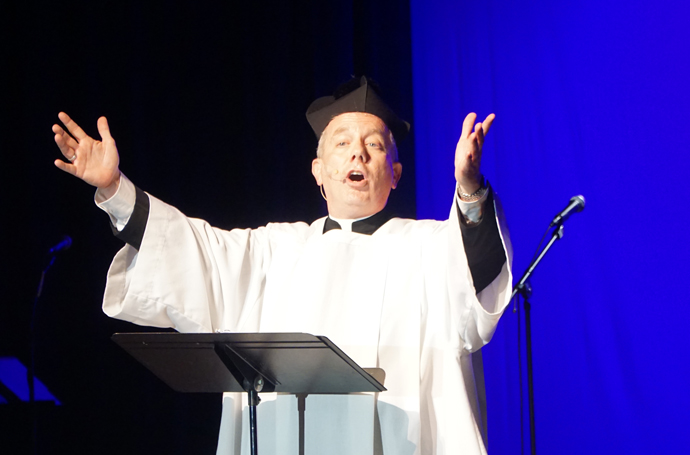Father Maurice Hayes, above, played the guitar and sang “Tennessee Whiskey” and “The Mermaid.” Father Troy Overton, below, sang a parody called “There’s No Business Like Church Business.” The show was a fund-raiser for the local chapter.