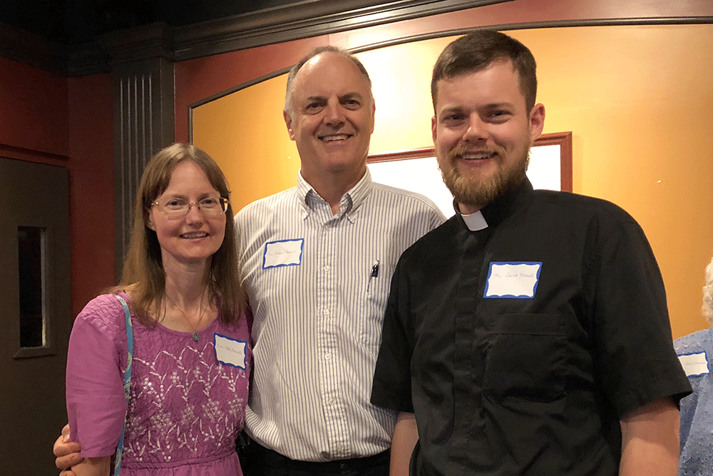 Father David Farrell, right, is pictured with his parents Joe and Patti Farrell at the 2018 Priests’ Parents Club luncheon for newly ordained priests. Father Farrell was ordained May 26, 2018.